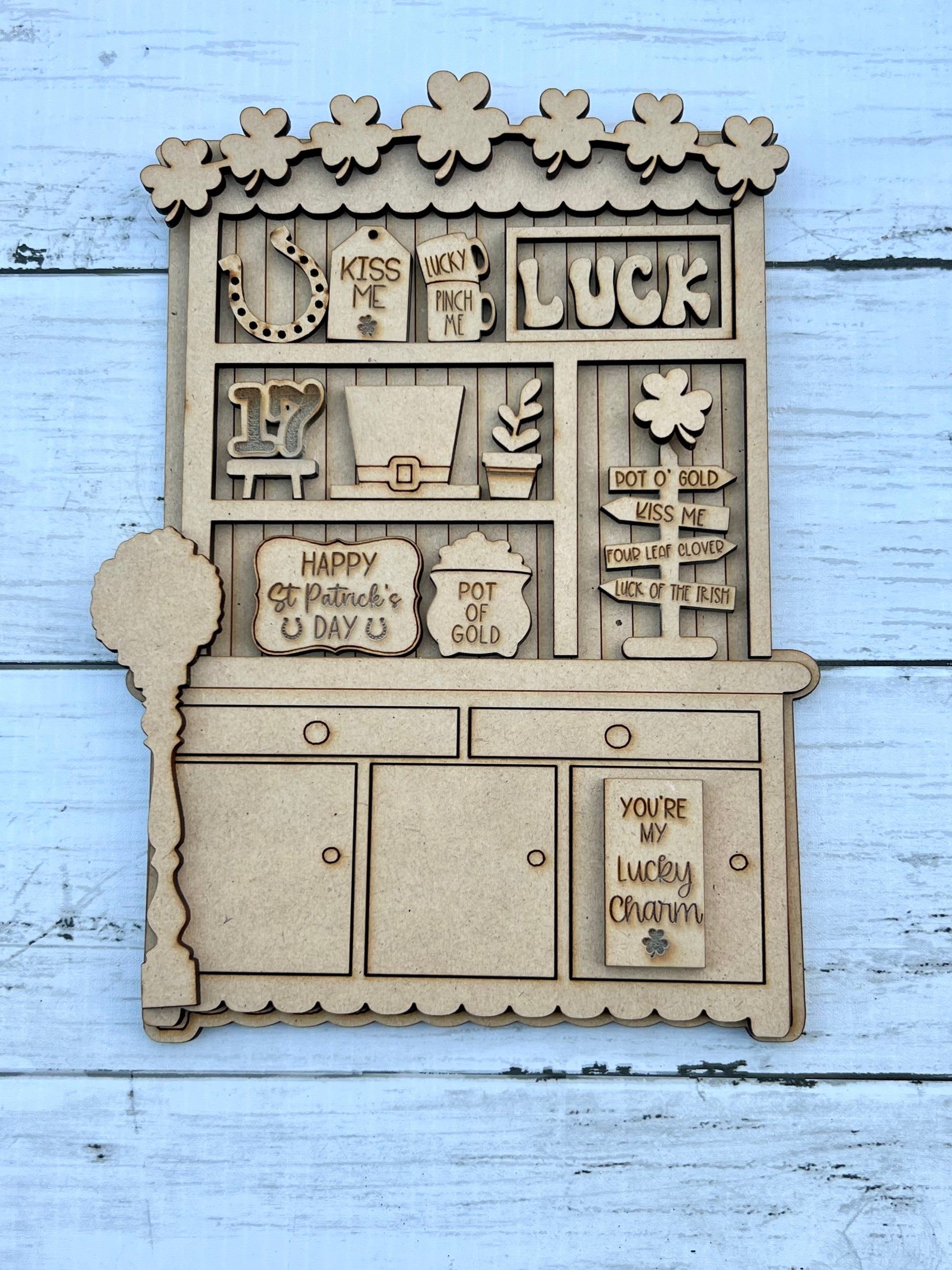 Enhance your space with this charming St Patrick’s DIY hutch! Measuring approximately 6x8 inches, this miniature hutch is a perfect addition to your home decor for your seasonal display